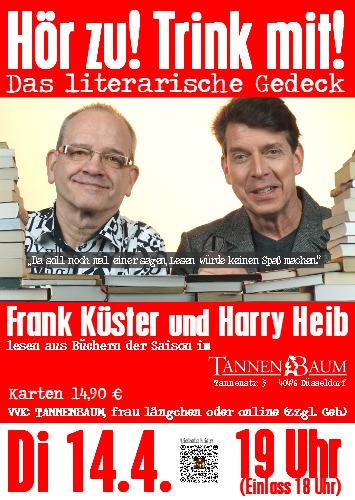 am 14.4.26 startet das große Vorlese-Vergnügen. Harry Heib (STUNK / Heinz Allein) und Frank Küster (BRUNO-SHOW / Reiner Tisch im Uerige) stürzen sich in ihrer fußläufig erreichbaren Lieblings-Kneipe TANNENBAUM auf Bücher der Saison und bringen Auszüge daraus zum durchaus amüsanten Vortrag. Redaktionell unterstützt von Mirjam aus der Buchhandlung „frau längchen“, Frankenstraße.